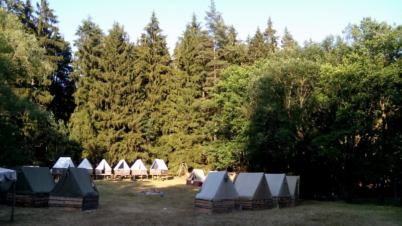 Od minulého pátku je na naší tradiční louce nedaleko Dražíče celkem rušno. Shrabali jsme posekanou trávu, naimpregnovali stanové plachty, zastřešili kuchyň a jídelnu, zbourali trosky spadlé kaple. Od čtvrtka se na vyměřeném náměstíčku začali objevovat první náznaky stanů a dnes již všichni spali ve svém. V sobotu 18.7. vám moc rádi všechno osobně představíme.